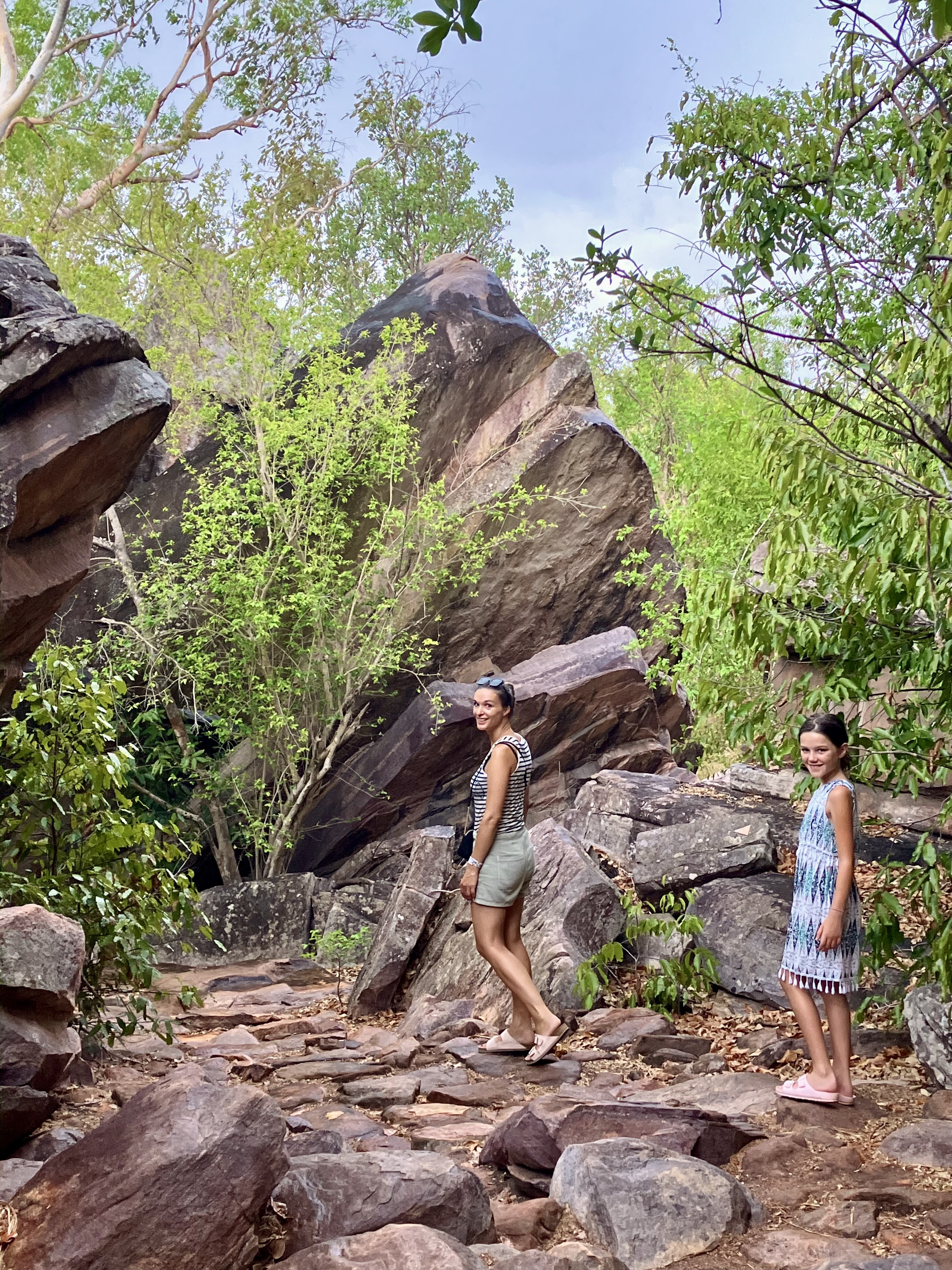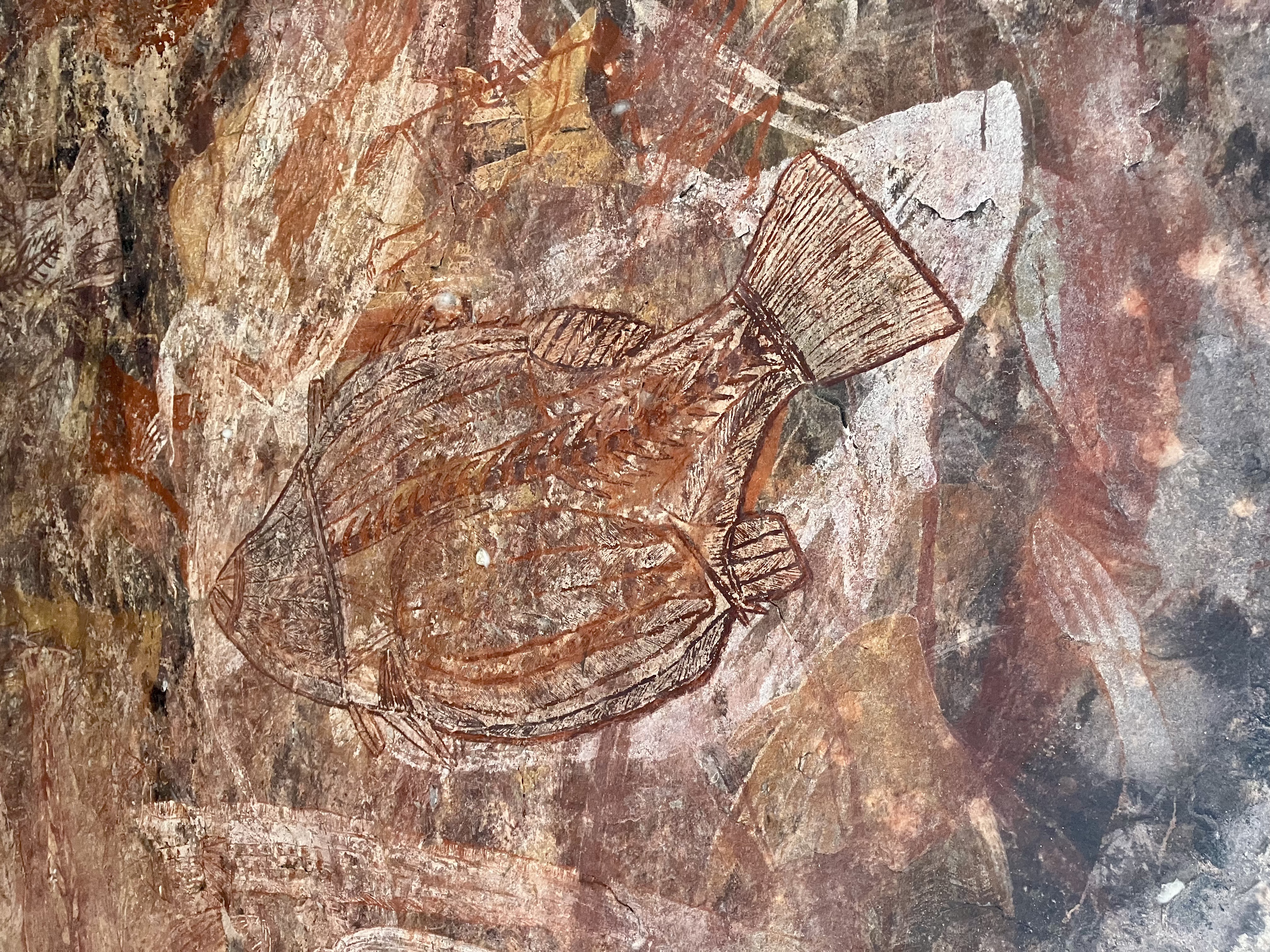 We arriveren in Ubirr, midden op de dag. Het is 15:00 uur, en alles lijkt in een andere dimensie te zijn blijven hangen. De rotswanden zijn versierd met schilderingen, sommige ouder dan 20.000 jaar. Maar deze werken zijn niet bedoeld om mooi te zijn of als schilderijen in een museum bewonderd te worden. Ik zou niet zeggen dat ze “magnifiek” zijn, maar ze stralen iets krachtigers uit: ze lijken levend. Ze zijn gidsen. De Aboriginals hebben ze gebruikt om hun overtuigingen over te brengen, hun kennis van de natuur te delen, en zelfs overlevingstips te geven: waar water te vinden, op welke dieren te jagen, en welke te vermijden.