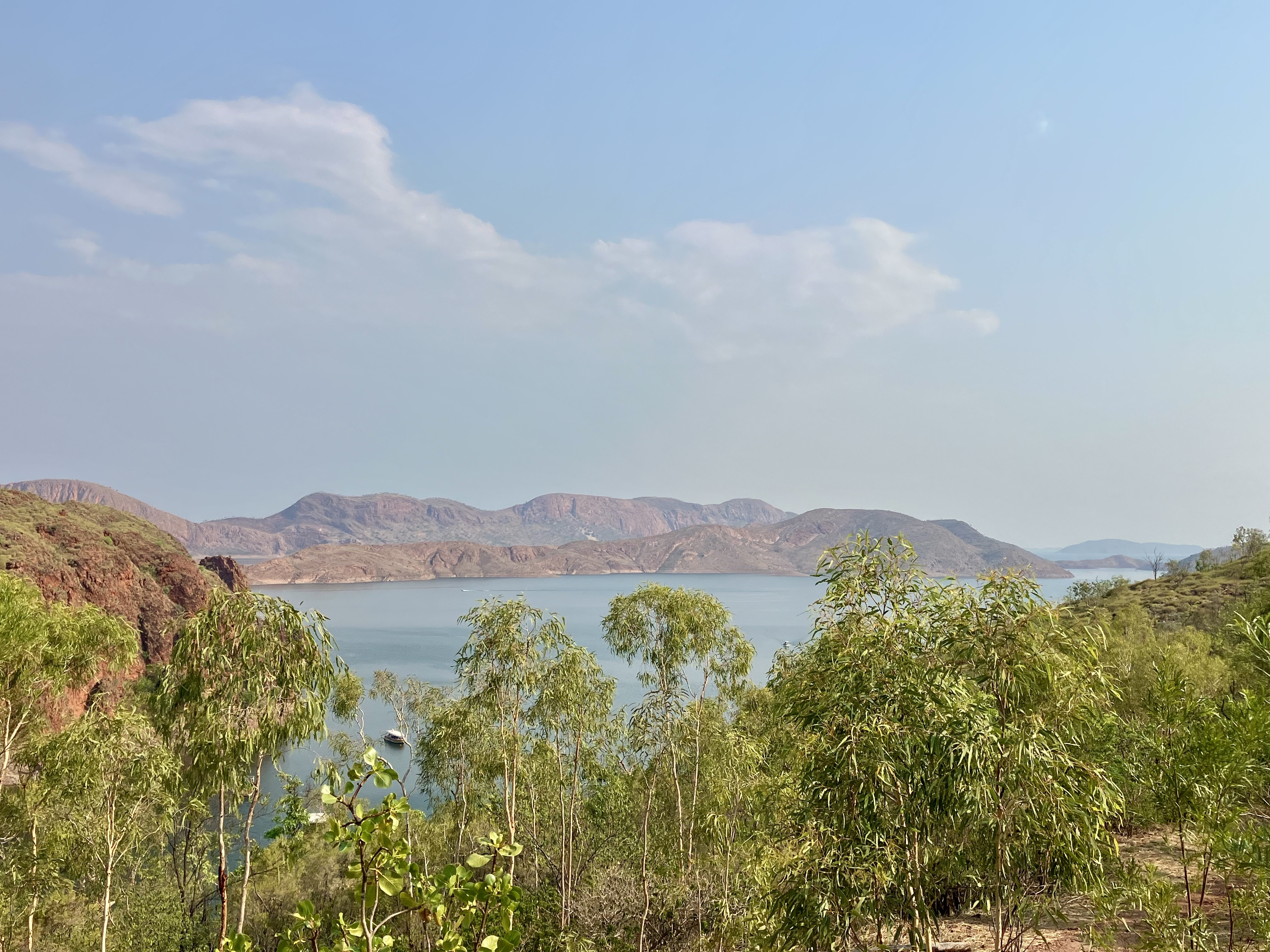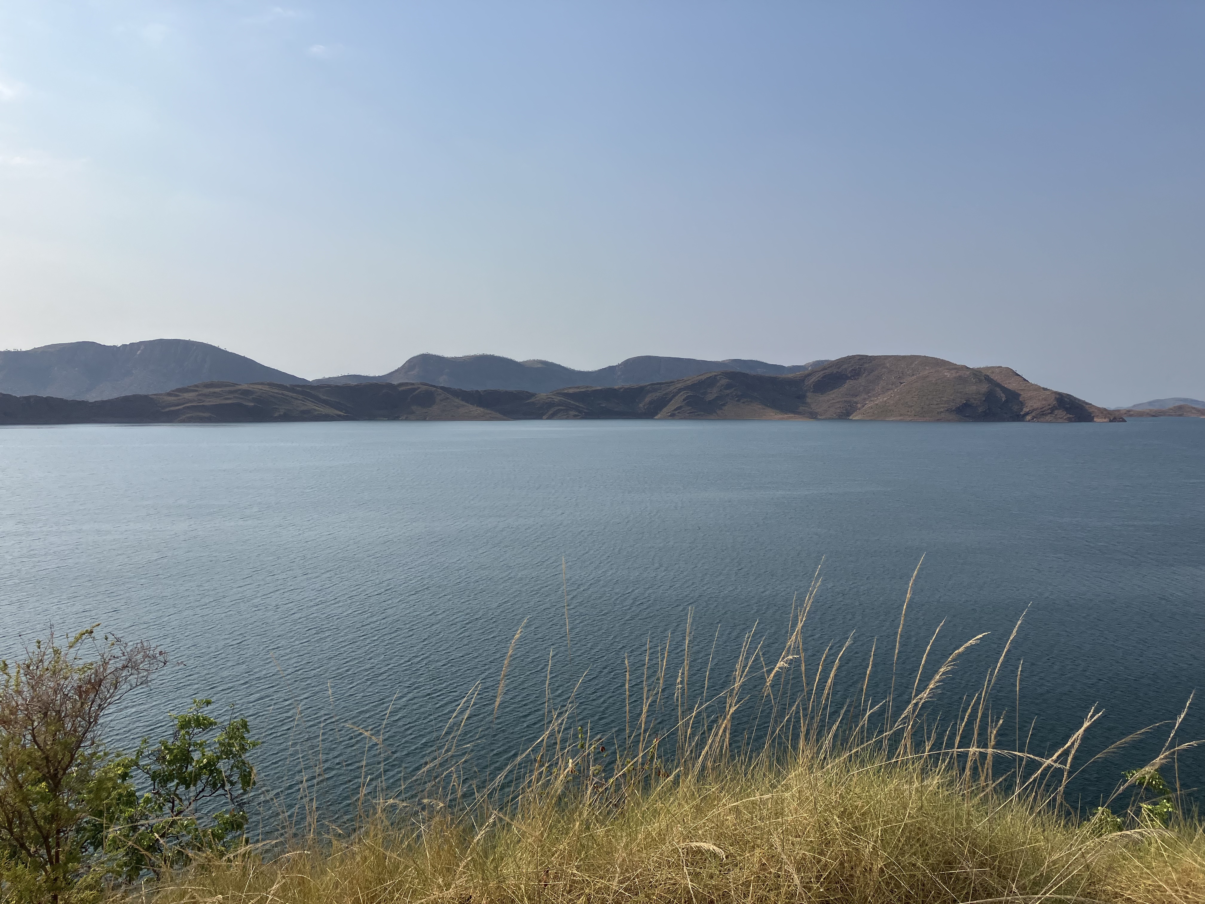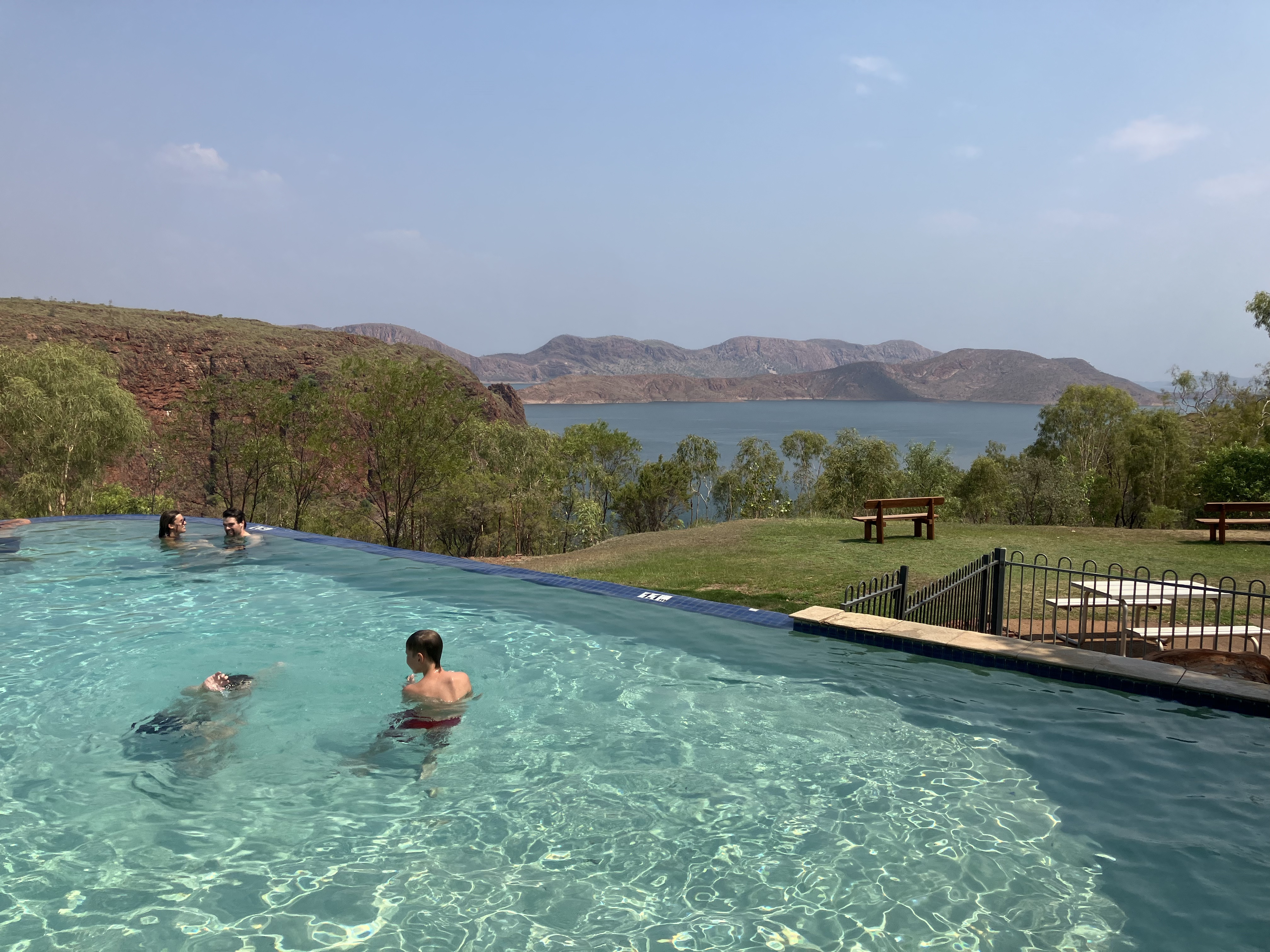 14 uur: eindelijk op de camping. En wat voor aankomst! Een infinity zwembad met uitzicht op het enorme Lake Argyle, een indrukwekkend wateroppervlak te midden van deze hitte. Het paradijs.