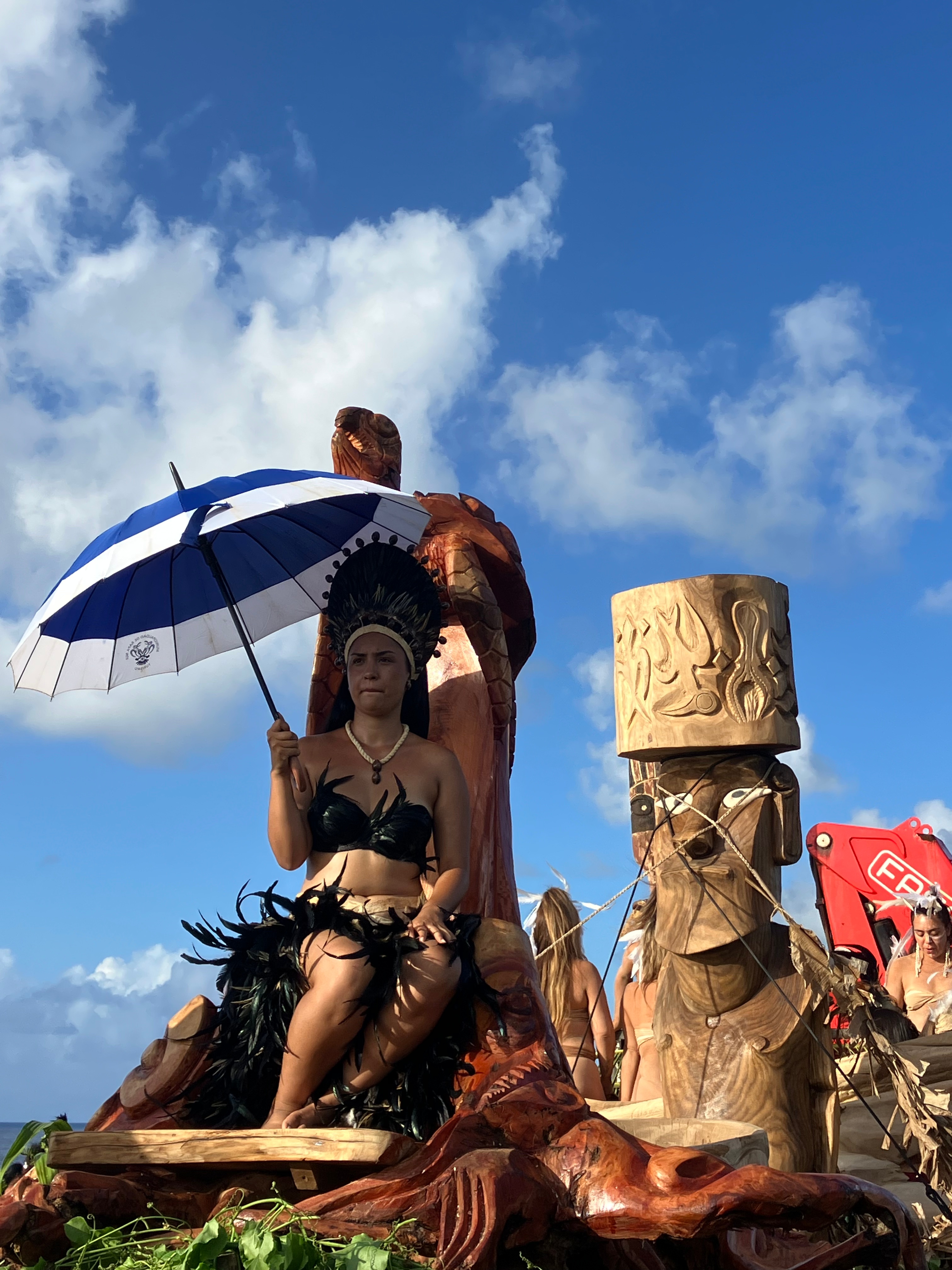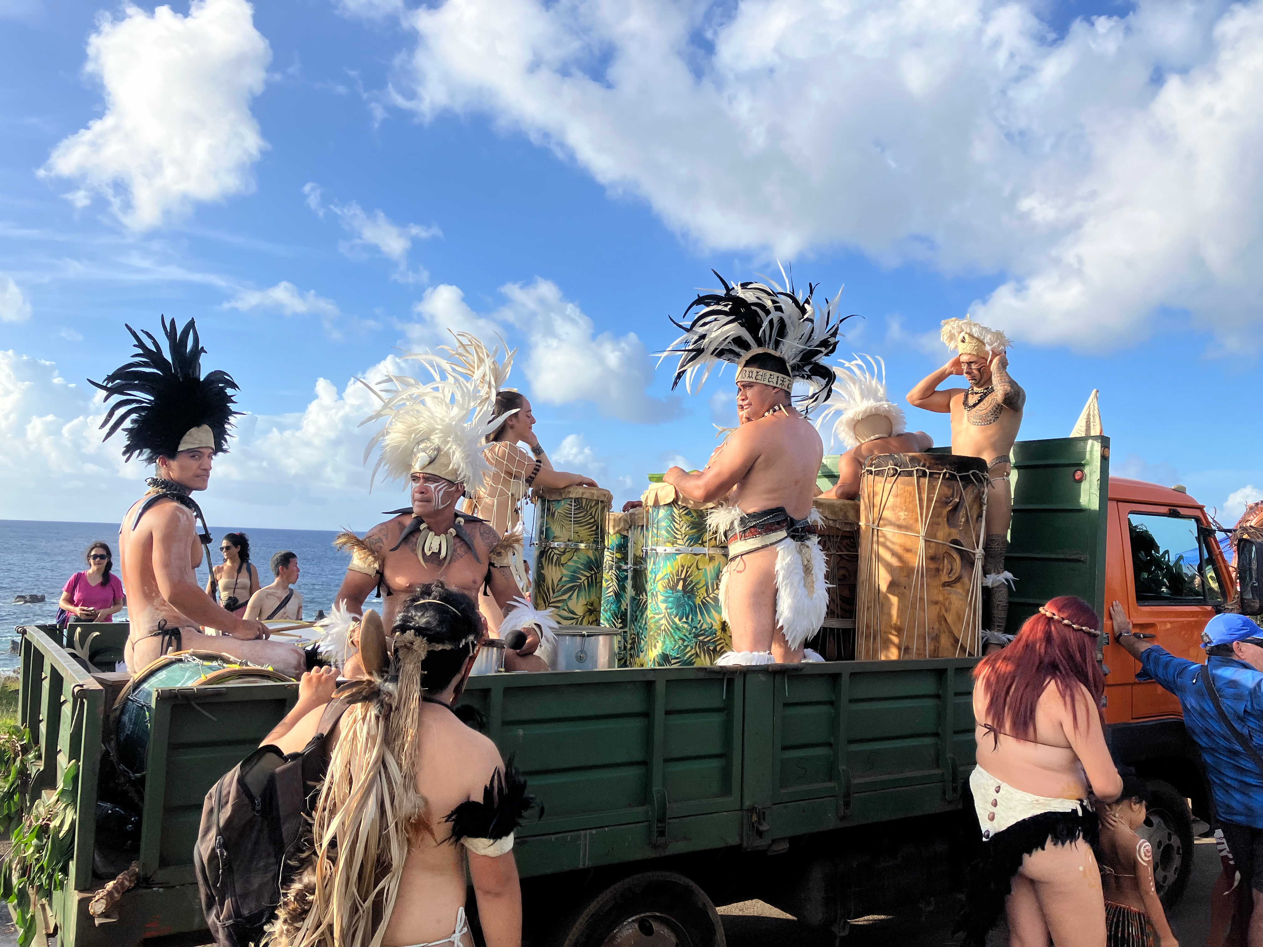 From what we saw, it felt like a giant carnival mixed with the Olympics—Easter Island edition. Canoe races, banana-trunk sledding down mountains, stone carving, parade floats…