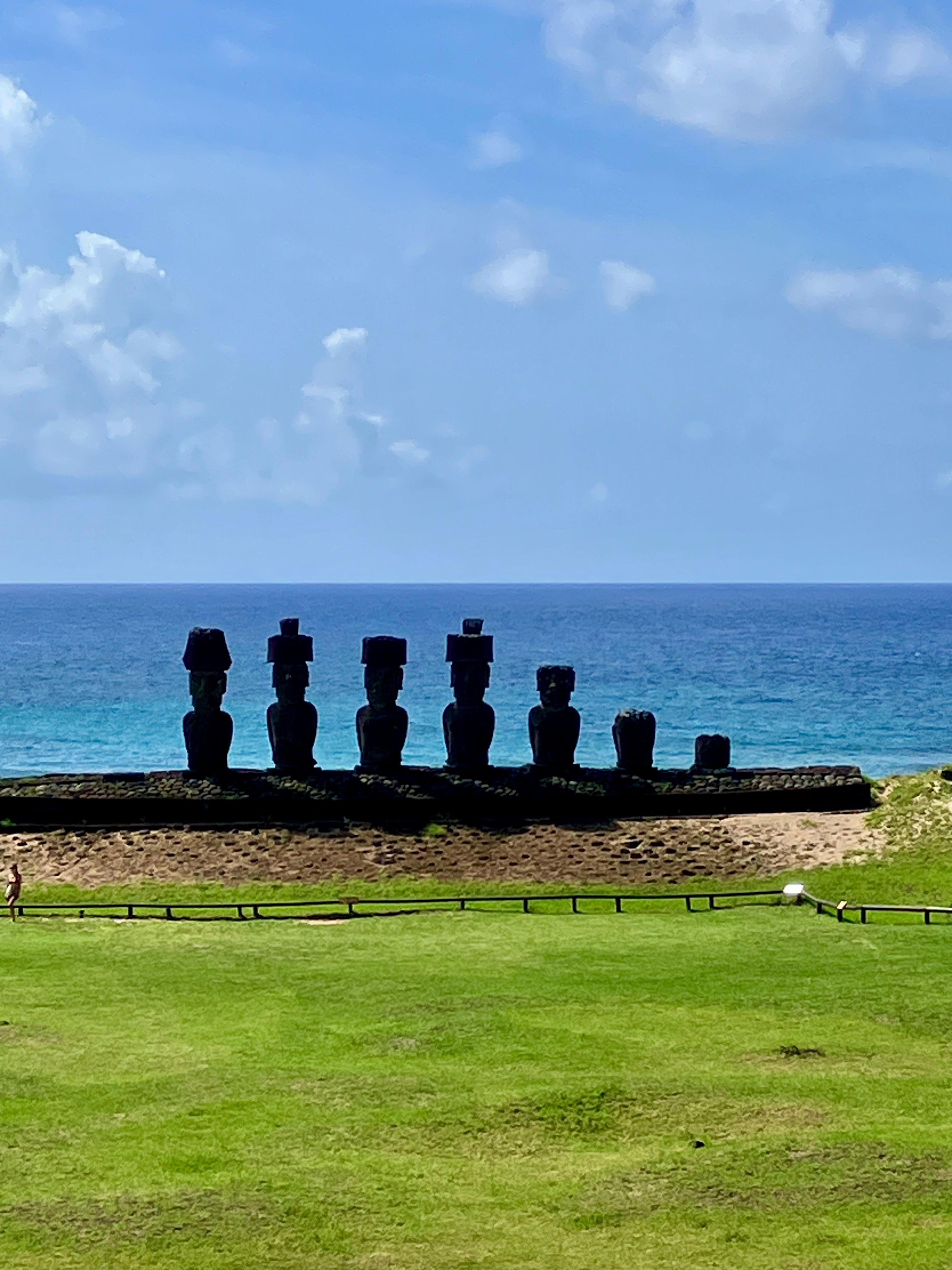Another must-see (and there are many, but I’ll leave them for you to discover someday) is Ahu Tongariki, the largest ceremonial site on Easter Island. Fifteen Moai, perfectly aligned, dominate the horizon—imposing remnants of a time when the island’s 21 villages each had their own stone guardian and held ceremonies here. These statues represented deified ancestors, watching over their people. They all face inland, turning their backs to the ocean, looking over the inhabited lands.