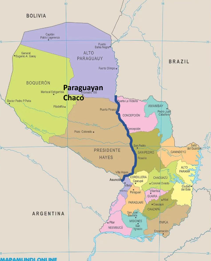 • À l’ouest, un territoire presque vide : le Chaco, qui occupe 60 % de la surface. La moitié de la France en désert vert. Une étendue plate, chaude, sèche, étouffante, où la terre est pauvre, les routes rares, et les moustiques, eux, omniprésents.