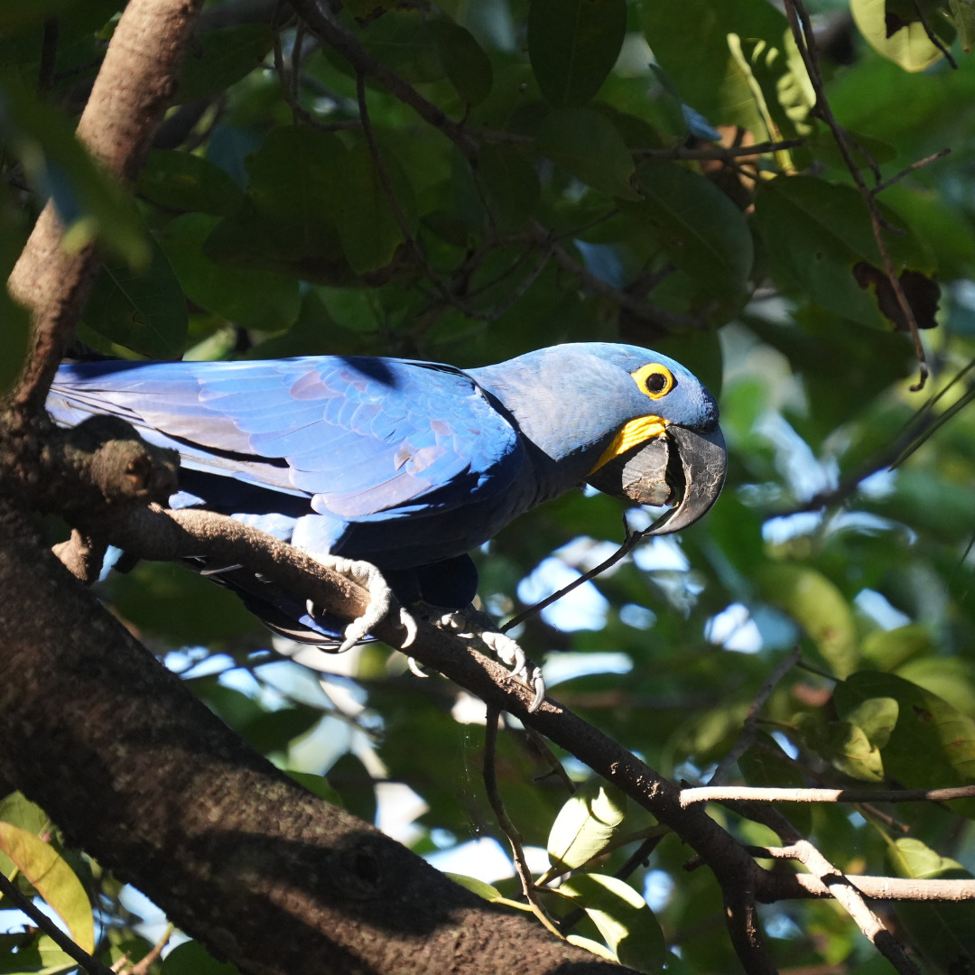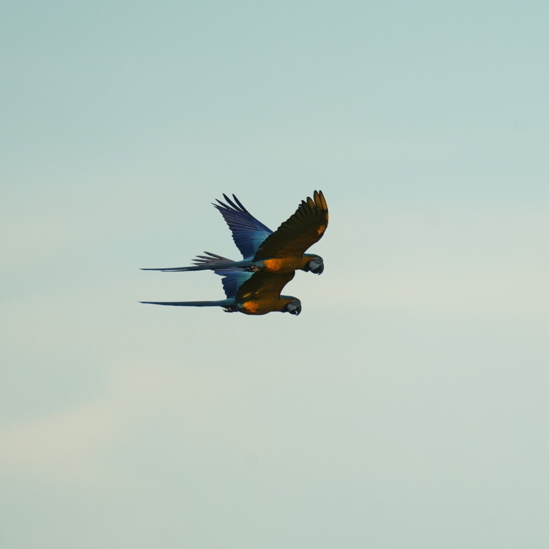 Climbing to the top of a lookout tower, we finally spot what we came for: hyacinth macaws. Majestic, brilliantly blue, these parrots soar over the plain like flying jewels. Some measure nearly a meter long — an unforgettable sight.
